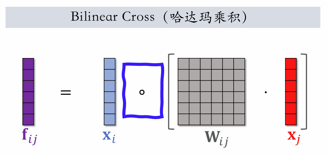 xiTx^T_ixjx_j 都是特征的 embedding 向量,fijf_{ij} 是一个向量,如果有 mm 个 field,他们之间两两哈达玛乘积,就会有 m2m^2 个向量。量太大,需要人工指定一部分向量做交叉,而不是所有向量都交叉。